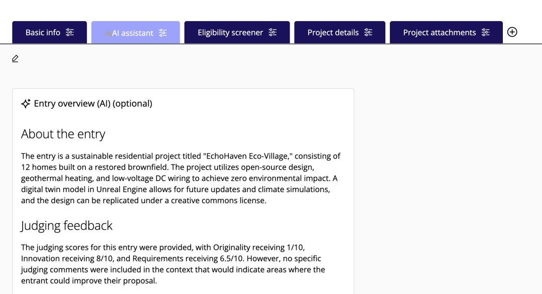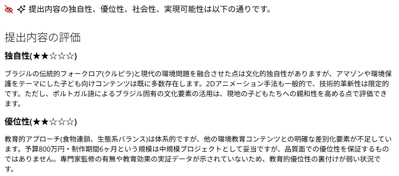 応募内容の独自性や優位性などを、AIツールで“参考”評価できます。これにより、審査員は応募内容を短時間で評価でき、予選時の合否判定や一次審査評価、またコメント作成を効率的に行えます。
