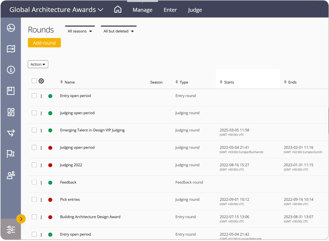 - プログラムマネージャー用:エントリー数、提出率、審査結果、全体の進捗状況をまとめて確認。プログラム全体を把握できるトップレベルビューです。