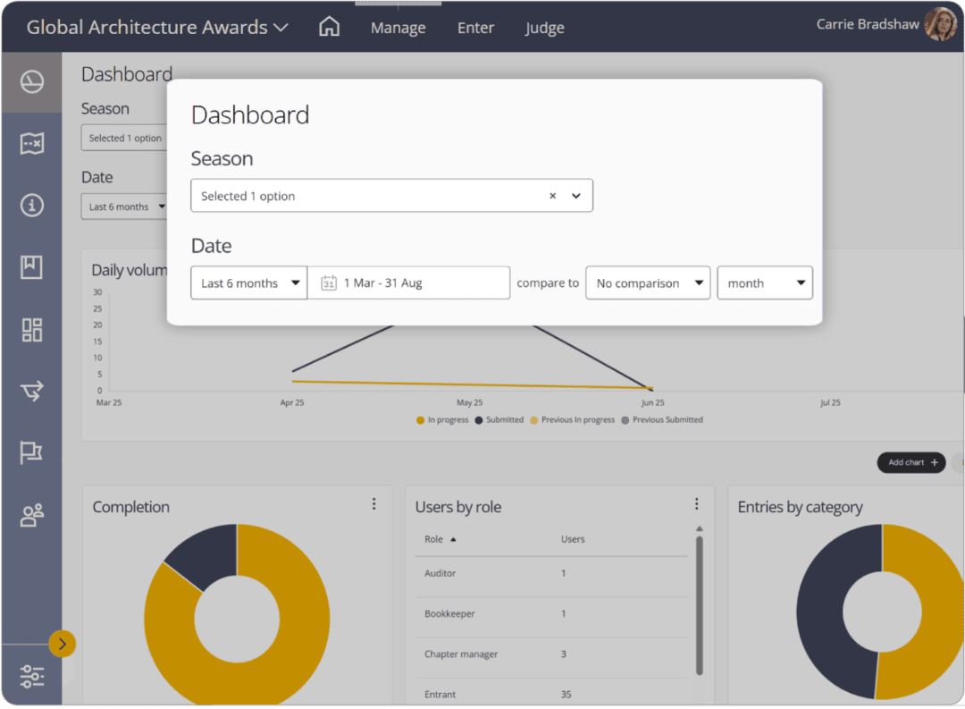 新しいダッシュボードは、エントリー状況の追跡や審査の進捗確認、成果測定までを一元的にサポート、スピードと拡張性を備え、最初から最後まで確実なコントロールを可能にします。