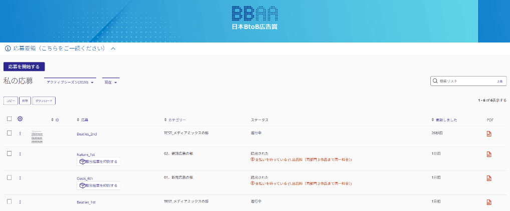 - 応募作品一覧ページより進行中・提出済等の管理が可能
