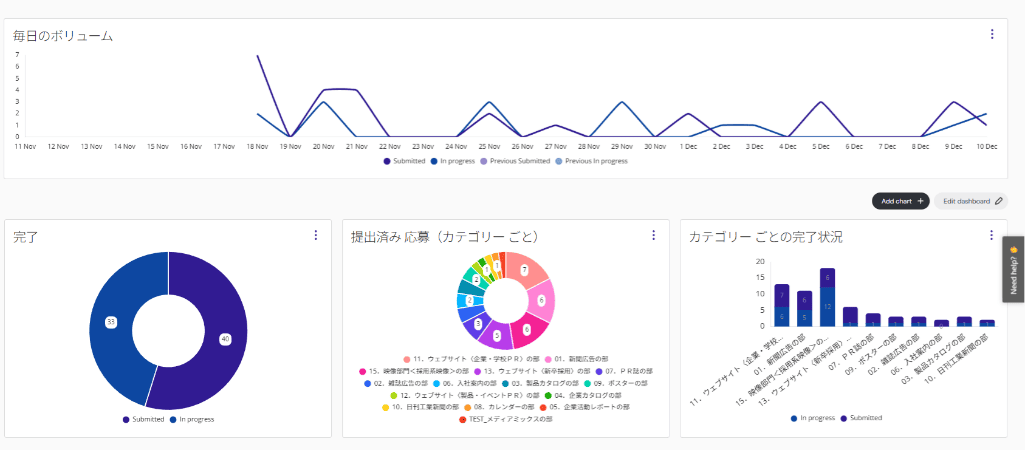 - 運営の質:ダッシュボードからリアルタイムに応募動向(部門別の応募進行・提出数等)分析が可能となり、提出を促すタイムリーな施策が行えます。また、次年度への改善施策の立案が容易になります。